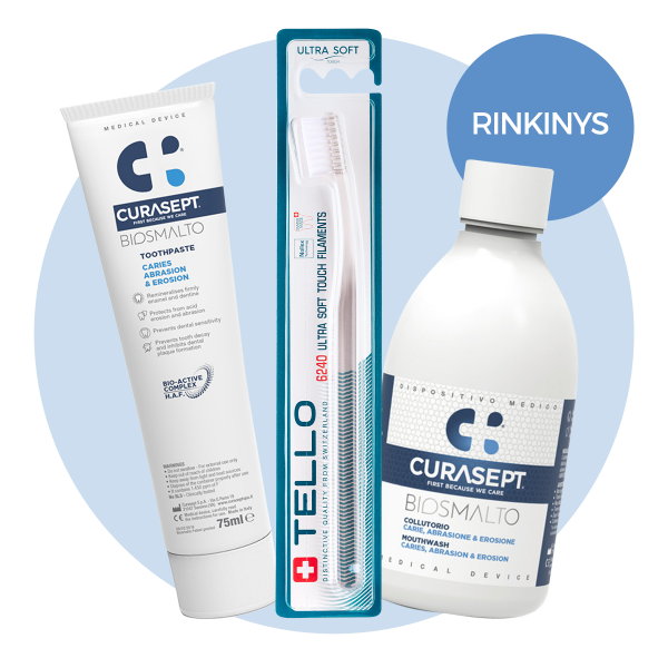 • Curasept Biosmalto Caries, Abrasion and Erosion burnos skalavimo skystis, 250 ppm fluoro, 300 ml. Plačiau apie produktą: https://bit.ly/3B4CgDl